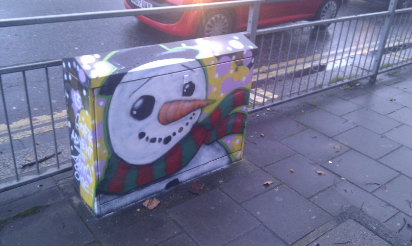 So here we are with more installments of the Grafik Warfare Advent Calendar Street project. Dec 13th sees a Sinna One Snowman in the mix, but no sign of snow just yet. A lot of rain, wind and very cold weather, but no snow.