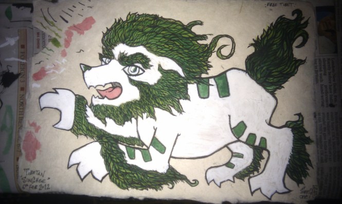 As I was flying from Bagdogra to Kolkata, I drew a small sketch of a Royal Bengal tiger, crouching and ready to pounce. I then drew a border very much in keeping with the Jamini Roy work that I had seen. I used the clouds from his ‘Procession’ painting that I had seen in the Victoria Memorial in Kolkata and drew a structure around the tiger as a border, in the mogul style, with minarets.