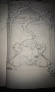 As I was flying from Bagdogra to Kolkata, I drew a small sketch of a Royal Bengal tiger, crouching and ready to pounce. I then drew a border very much in keeping with the Jamini Roy work that I had seen. I used the clouds from his ‘Procession’ painting that I had seen in the Victoria Memorial in Kolkata and drew a structure around the tiger as a border, in the mogul style, with minarets.